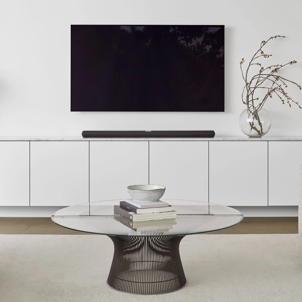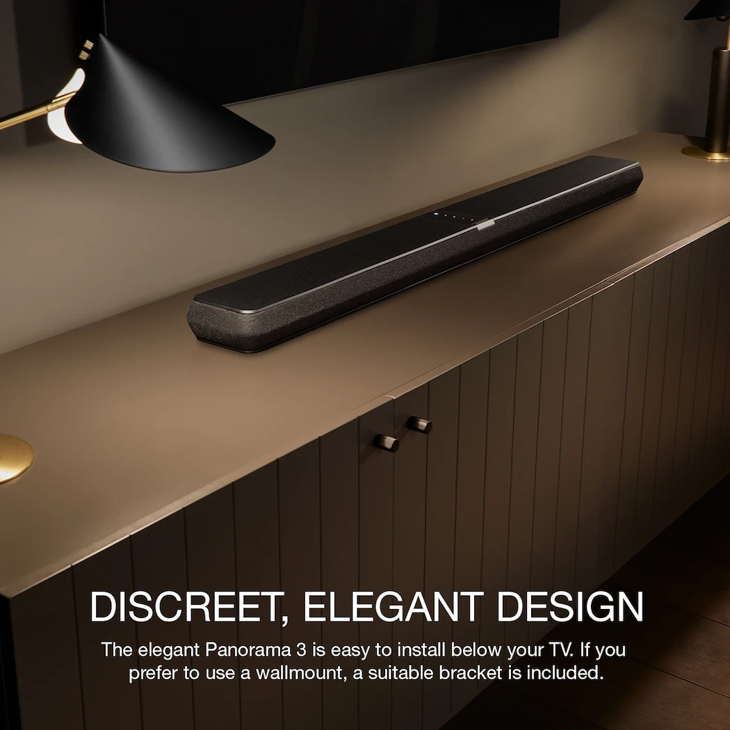 Panorama 3’s ultra-low-profile makes it easy to install below modern flat-panel TVs. Its hidden-till- lit user interface and premium materials designed to complement any home ensure an elegant installation. If you prefer to wall-mount your Panorama 3, a suitable bracket is included.
