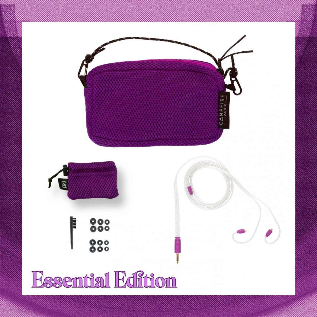 - Essential Edition: Your all-in-one kit with curated must-haves. Includes a Breezy Bag Standard, Time Stream Cable in default 3.5mm termination, marshmallow and silicone tips for optimal comfort, a precision cleaning tool, an exclusive Campfire Audio pin, and a dual-pocket Breezy Bag Micro to keep your earphones secure.