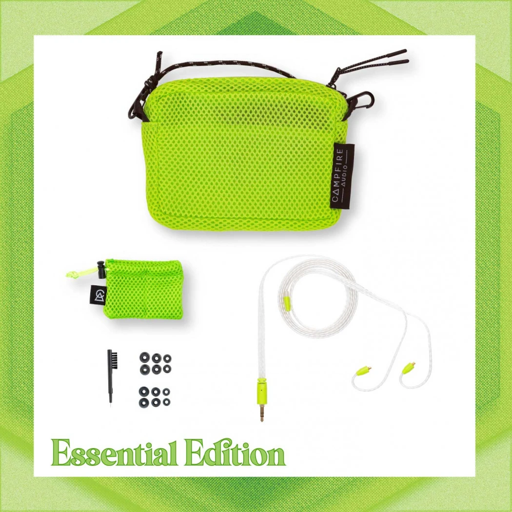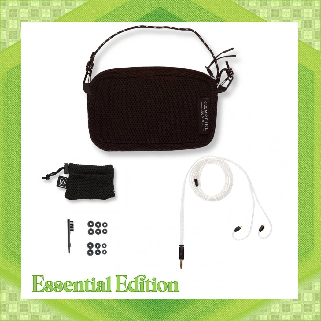 - Essential Edition: Your all-in-one kit with curated must-haves. Includes a Breezy Bag Standard, Time Stream Cable in default 3.5mm termination, marshmallow and silicone tips for optimal comfort, a precision cleaning tool, an exclusive Campfire Audio pin, and a dual-pocket Breezy Bag Micro to keep your earphones secure.