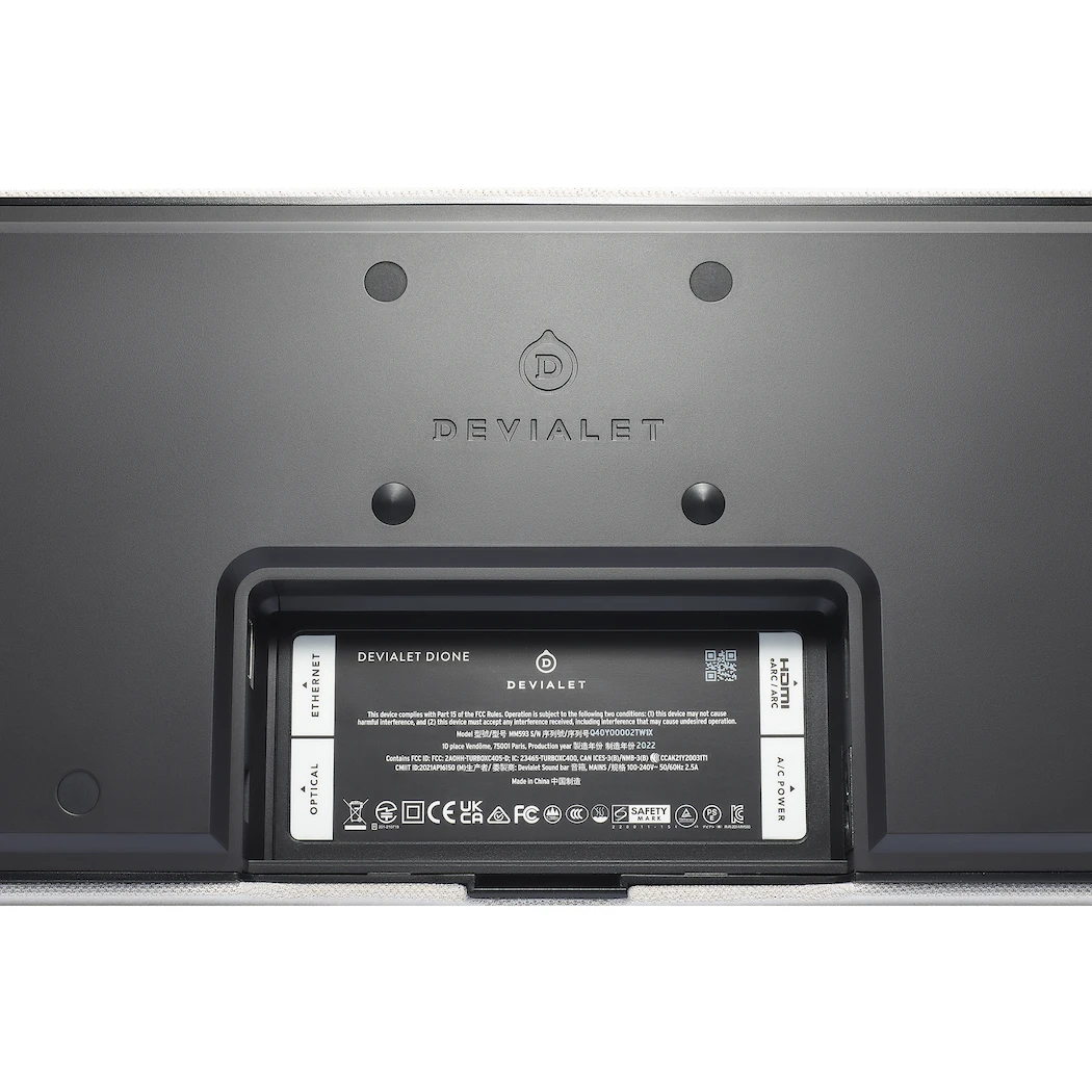 With the best performance-to-thinness ratio, Devialet Dione stands out in both design and sound quality, and blends in when the action begins. And its sleek central ORB®️ is a nod to Phantom’s signature aesthetic. Thin and discreetly angular, Dione integrates beautifully into the home. Measuring 47 inches (1200 mm) wide, 6.5 inches (165 mm) deep, and 3.5 inches (77 mm) tall, the soundbar is carefully crafted with premium material all around, with the central core body made from anodized aluminum and coated with acoustic fabrics.