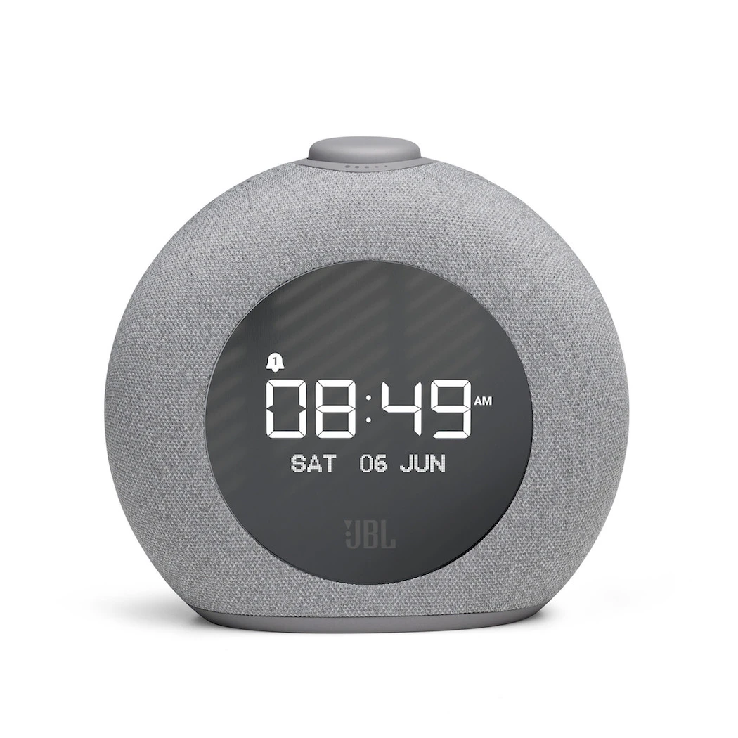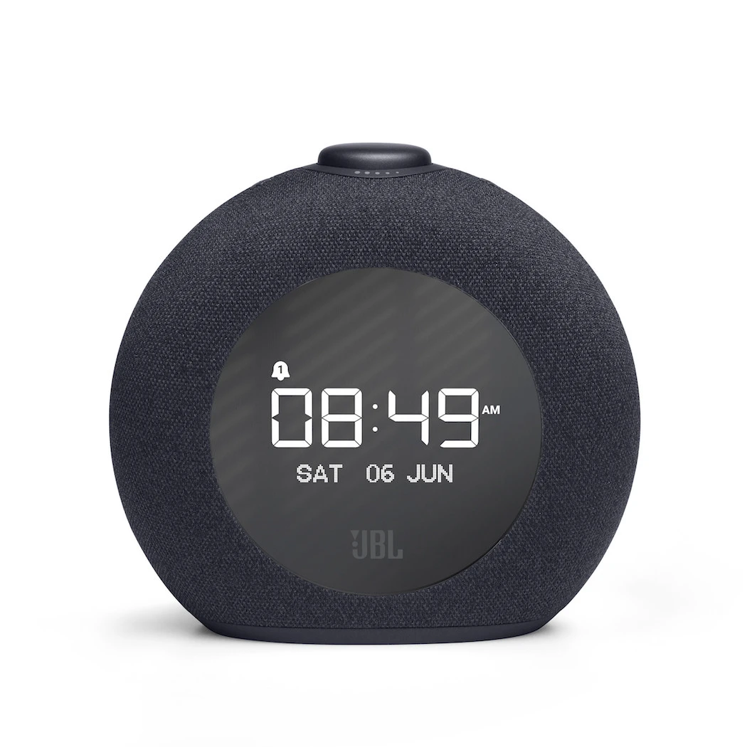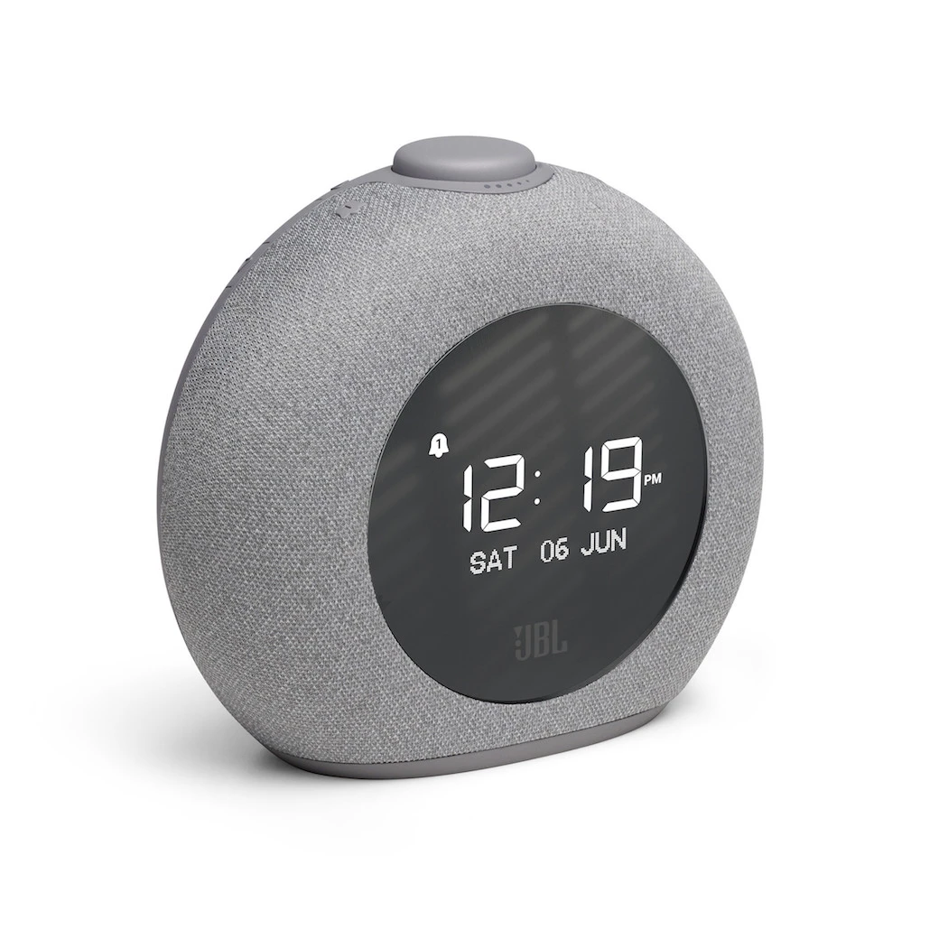 Wake up to JBL Pro Sound. With its signature round design, ambient LED light and FM radio, JBL Horizon 2 completes any bedroom. A large LCD display clearly shows the time, alarm settings and radio info, while the lifestyle fabric cover blends perfectly with any decor.