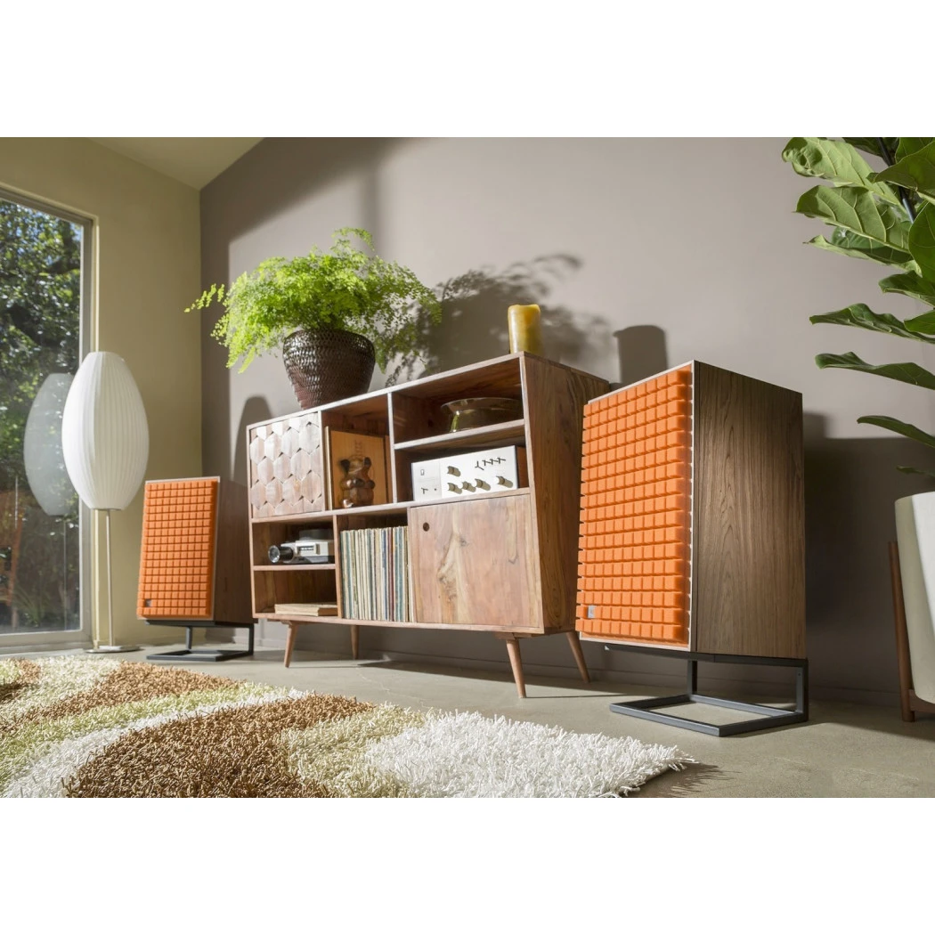 The L100 Classic uses the newly developed JT025Ti1 1-inch (25mm) Titanium dome tweeter mated to a waveguide with an acoustic lens for optimal integration to the JM125PC 5-inch (125mm) cast-frame, pure-pulp cone midrange driver located directly below. The vertical HF and MF transducer arrangement is slightly offset to the right of the woofer below, with HF and MF attenuators located on the upper left of the front baffle. Low frequencies are delivered by the 1200FE 12-inch (300mm) cast-frame, white pure-pulp cone woofer operating in a bass-reflex enclosure system that is tuned via a single, front-firing port tube with flared exit. Connections are made via a pair of gold-plated binding post terminals located on the rear-panel.