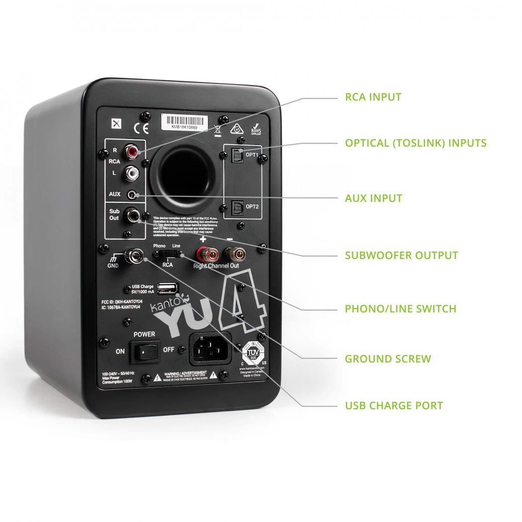 Vinyl: YU4 comes equipped with a built-in phono preamp, allowing you to easily connect any vintage or modern-day turntable. Toggle between line-level and phono with a simple flip of a switch, and reduce noise using the provided ground terminal.