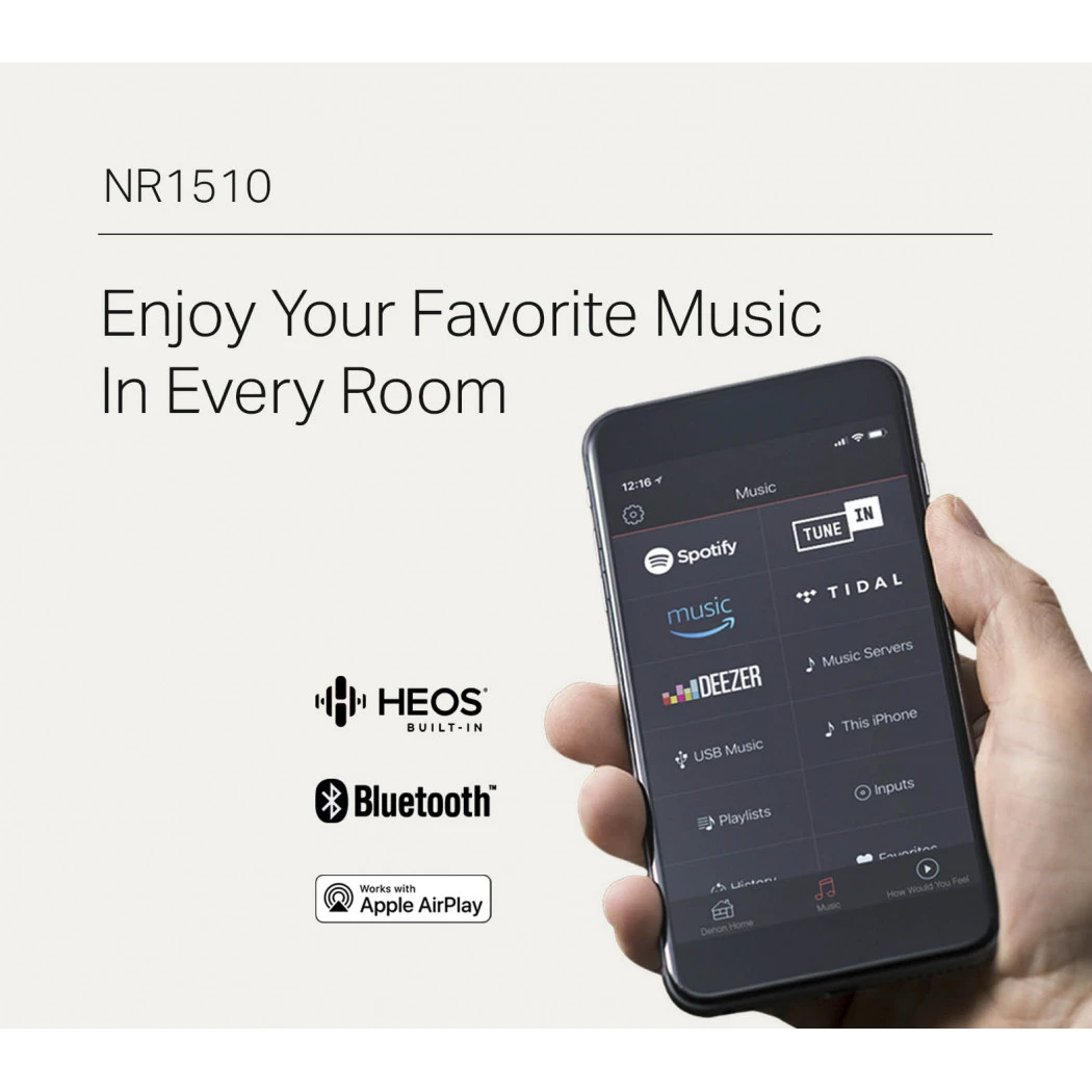 At half the height of a traditional AV receiver, the NR1510 features the latest in HDMI connectivity and delivers high-resolution surround sound from Dolby TrueHD and DTS-HD Master Audio. Six HDMI inputs — including one on the front panel — support the latest video and picture formatting and eARC transmission of enhanced audio. Stream music from popular online sources, and easily connect your analog turntable to the receiver to enjoy your vinyl collection. Control the NR1510 with voice control compatibility.