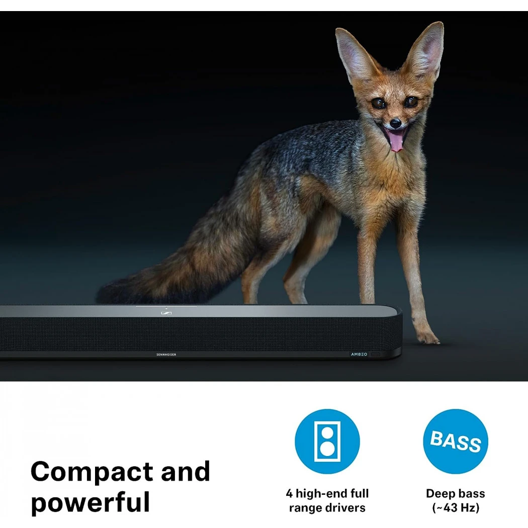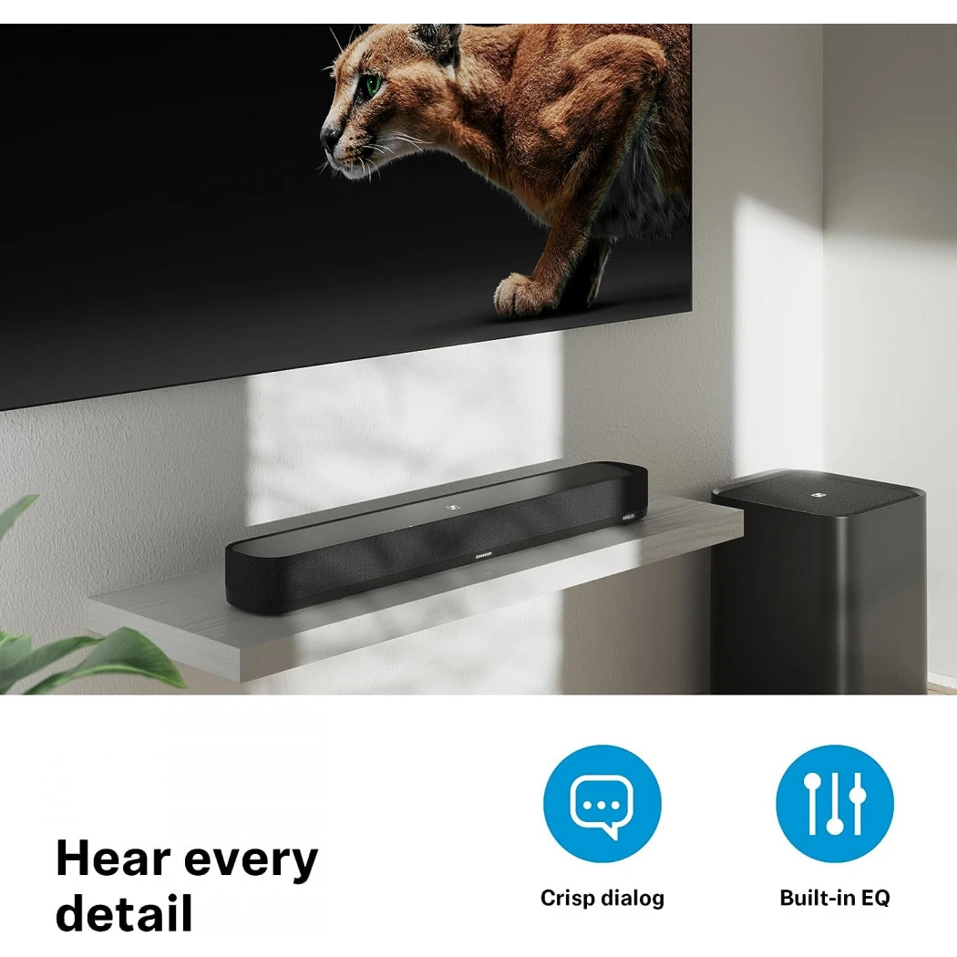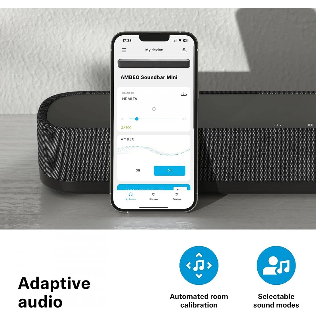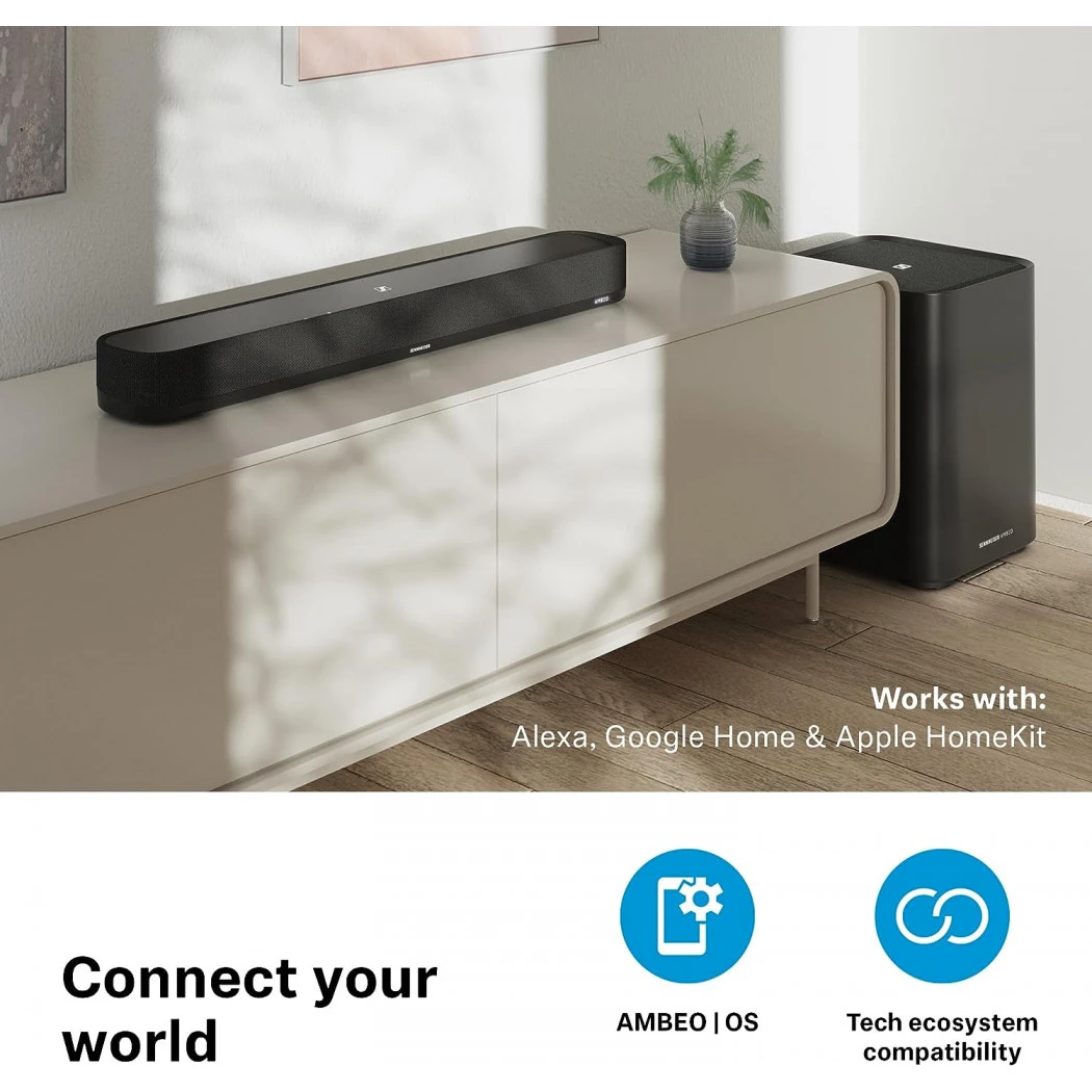 Finally, a soundbar that provides high-end sound, without a huge footprint. Under 28 inches wide, AMBEO Mini fits together with even the smallest TVs in compact spaces.