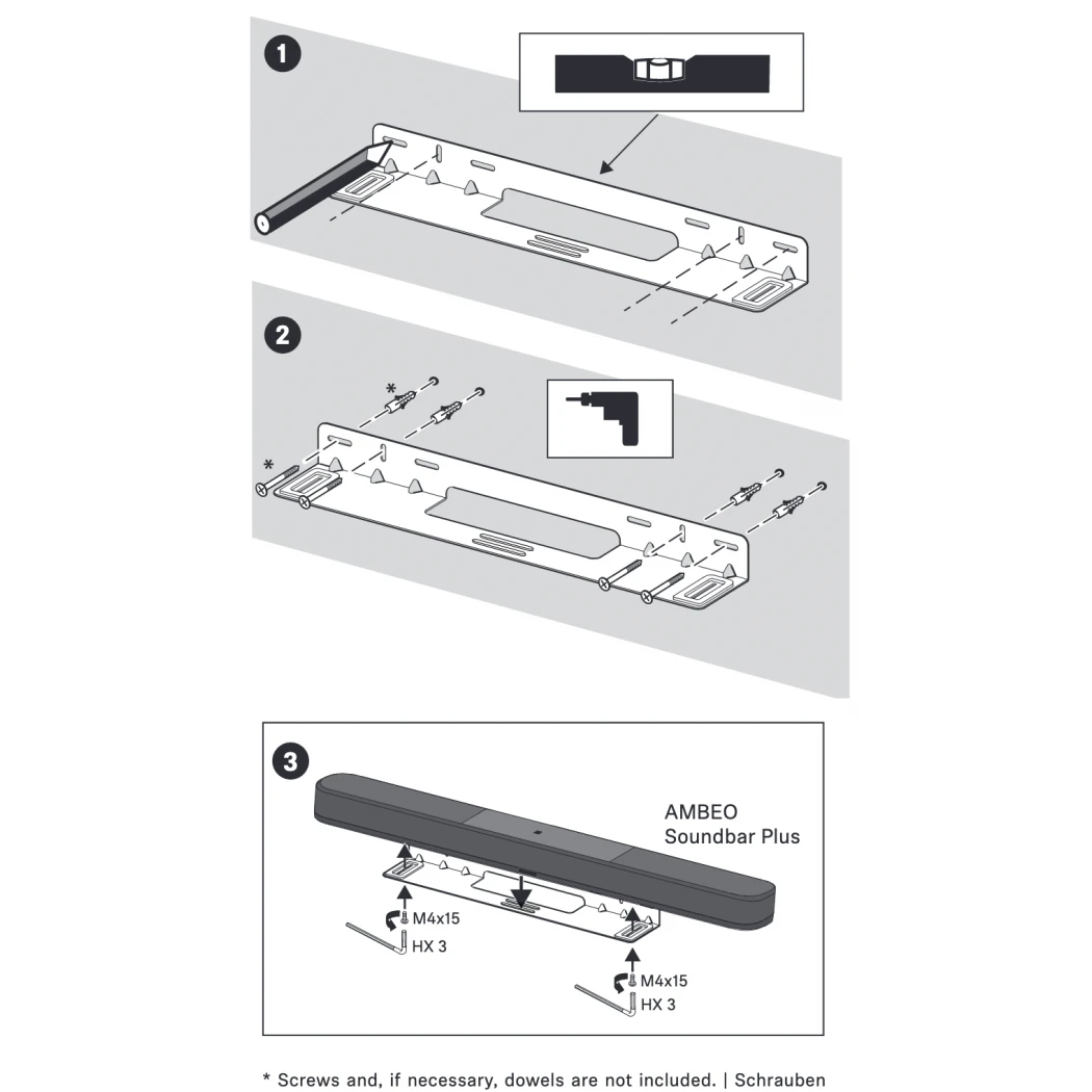 Screws for affixing the wall mount to the wall are not delivered with the soundbar, as different wall materials will require different screw types.